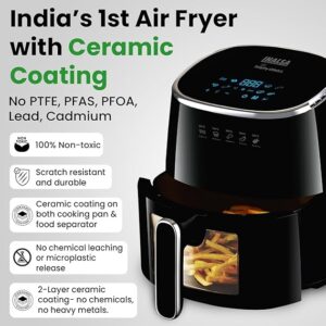 | Inalsa Tasty Fry | Toxic Chemicals | 100% Non-toxic Ceramic; no peeling. | Fan is a bit louder. | 🛡️ View Safety Ratings |